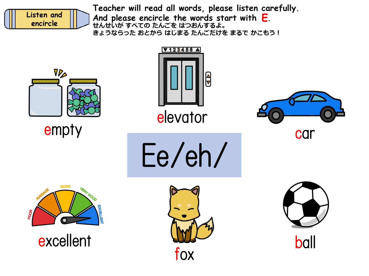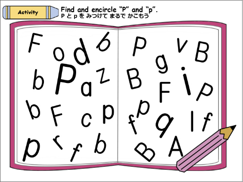 教材サンプルを見るアルファベットを視覚的に認識することを目標としています。 色々なアクティビティを通して、アルファベットひとつひとつ丁寧に、それぞれの名前(エイ、ビー、シー)を覚えましょう。