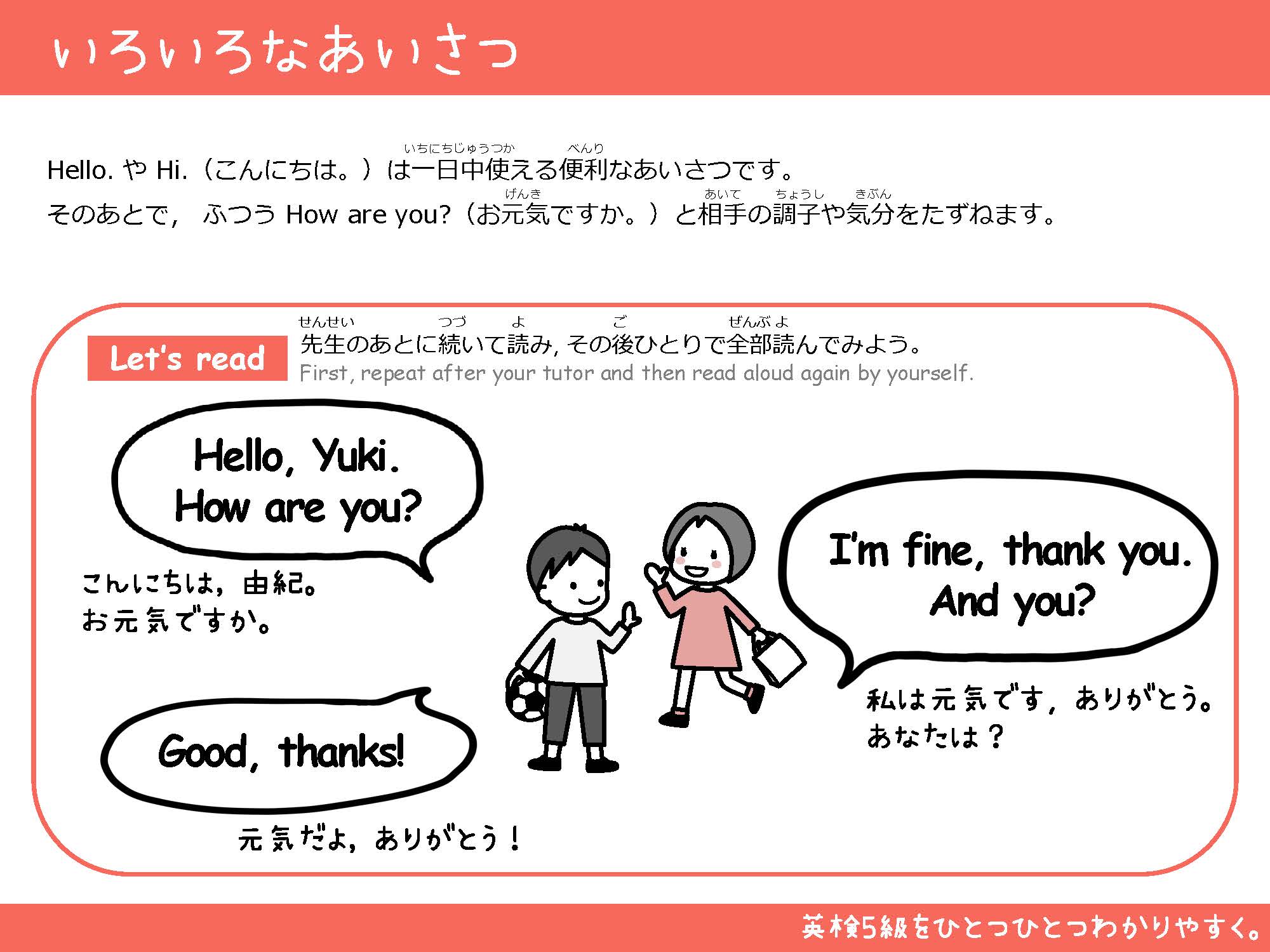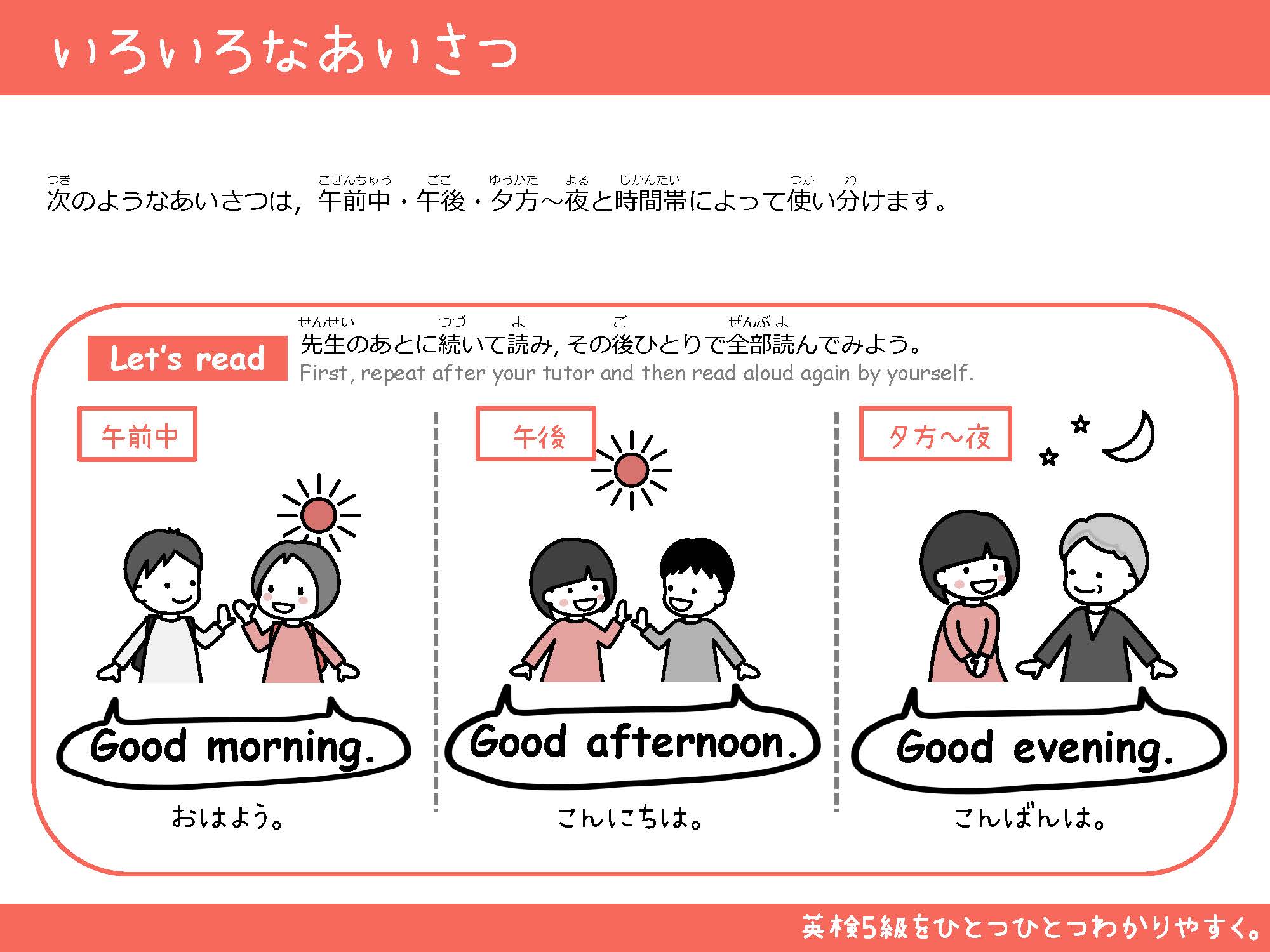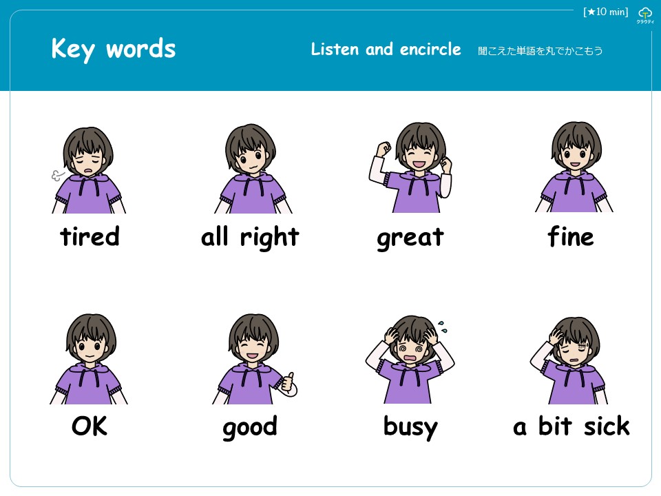 教材サンプルを見る日々の生活の中で身近にある単語を学習し、それを用いて天気や時間、自分の好きなこと、過去のことなどについて簡単なフレーズを用いて会話をする練習をします。