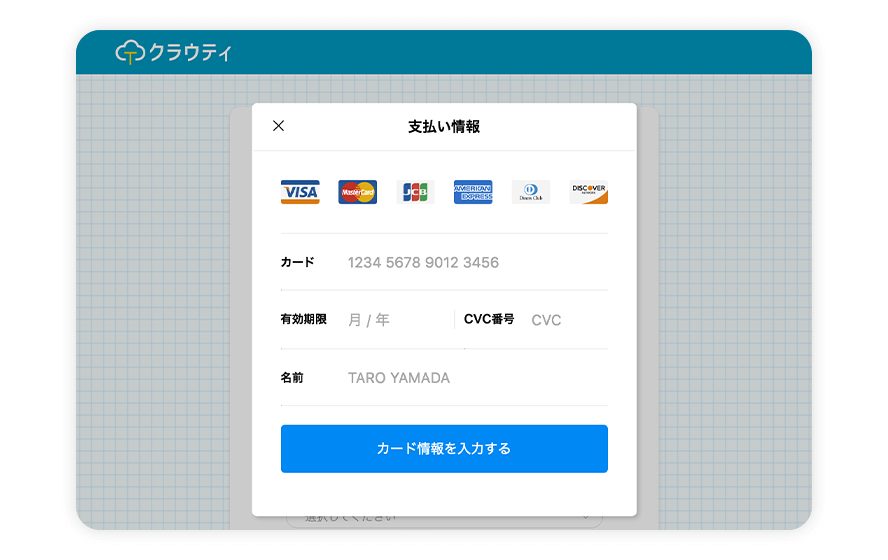 カード情報をご入力ください。無料期間が終わるまでは、カードの自動決済はされませんのでご安心ください。