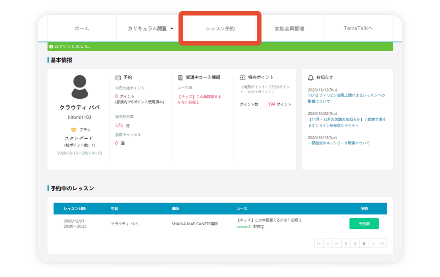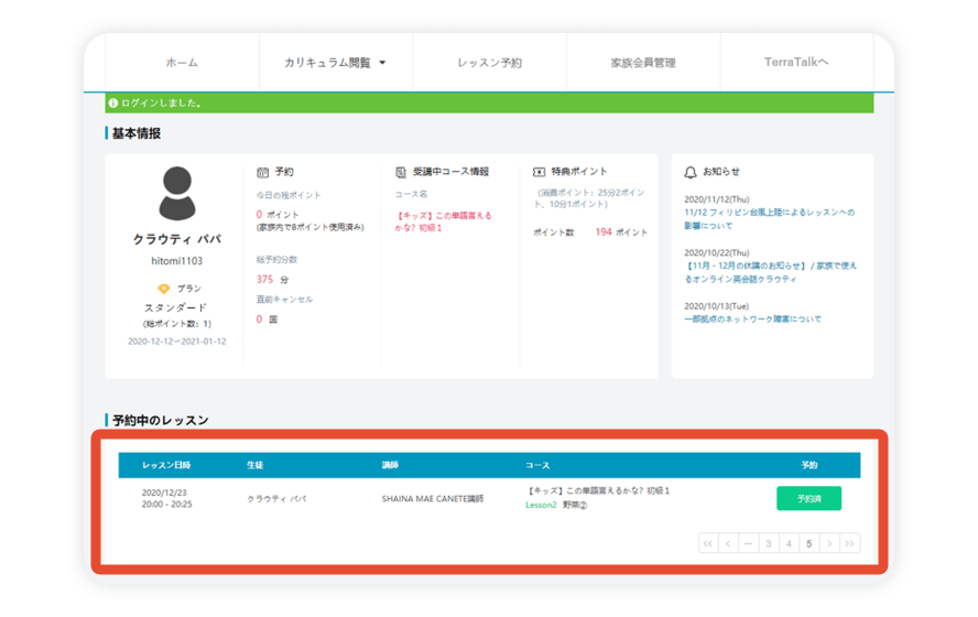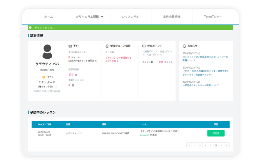 クラウティEnglishの会員マイページでは、現在のプラン・予約時間・受講中コース・予約回数・家族会員の使用ポイント数などの基本情報を確認できます。