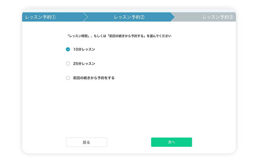 「10分レッスン」と「25分レッスン」からレッスン時間を選択してください。前回受けたレッスンの続きを予約したい場合は、「前回の続きから予約をする」を選択してください。