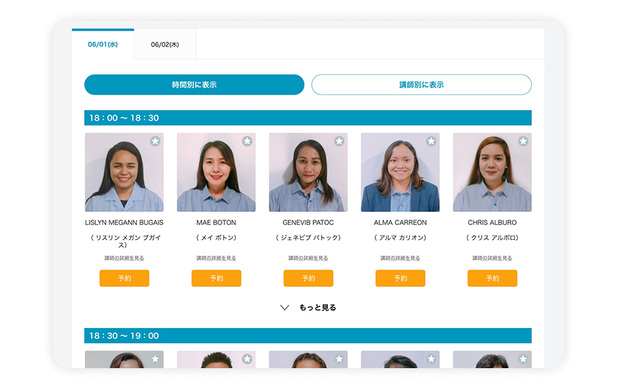 時間別に表示メニューを選択すると、時間別に予約できる講師が一覧で表示されます。
