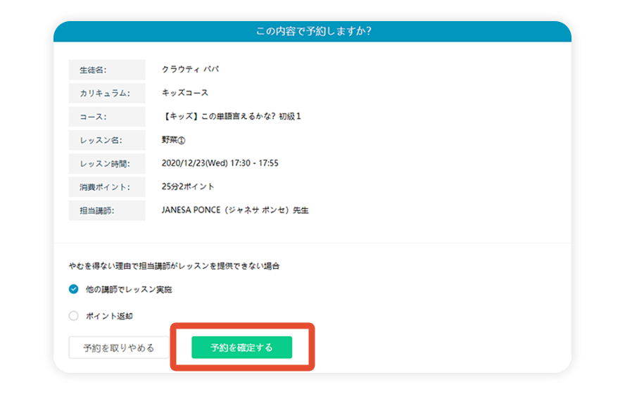 ここまで選択してきたカリキュラム・コース・レッスン・時間・講師の詳細が一覧で表示されます。予約したい内容に間違いがなければ「予約を確定する」をクリックしてください。