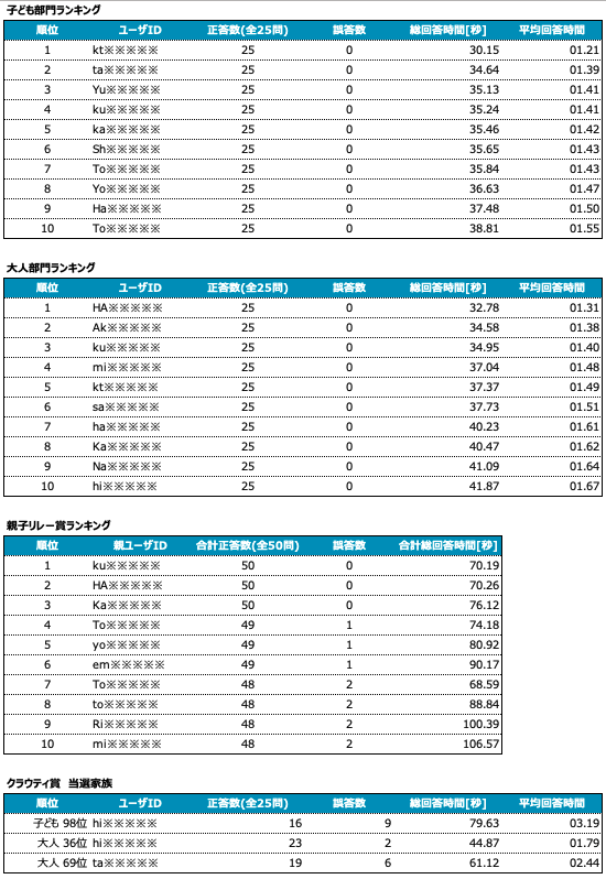 子ども部門では16名の方が、大人部門では13名の方が全問正解でした!