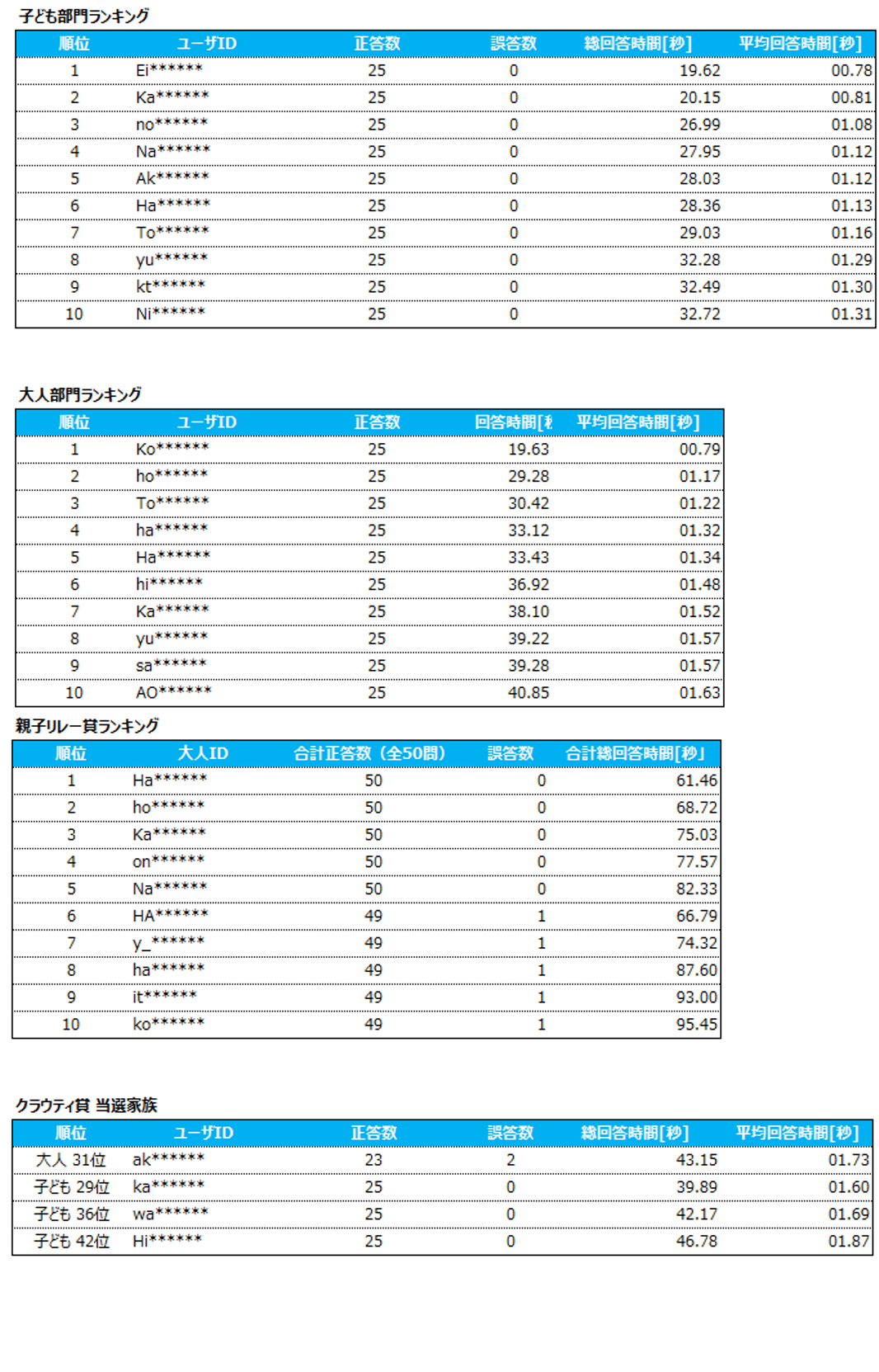 子ども部門1~3位、大人部門1位、親子リレー賞、クラウティ賞当選の会員様へは、景品をお送りいたしますので、別途、配送先情報ご提供依頼をメールにてご連絡させていただきます。