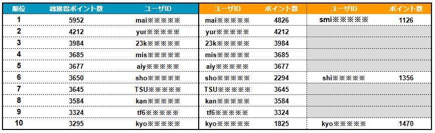 なお、ご家族でご参加いただいた場合、それぞれのアカウントで獲得されましたポイントの内訳も下記順位表の右半分に記載しております。