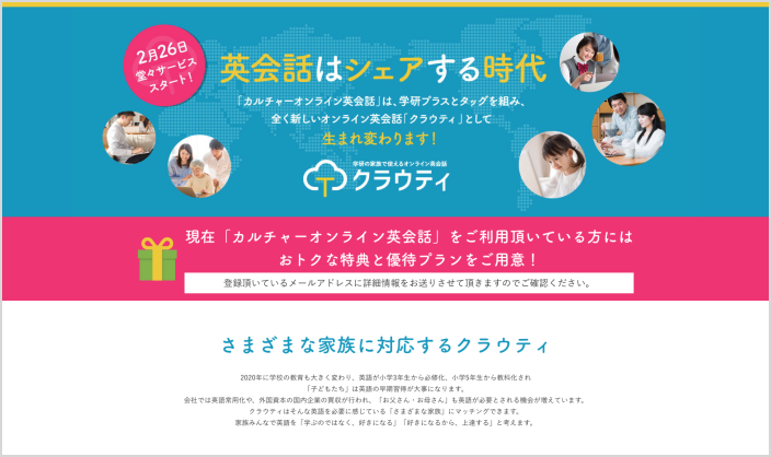 2018.02.26 お知らせ クラウティに生まれ変わりました! 2018年2月26日より、カルチャーオンライン英会話は学研プラスとタッグを組み、全く新しいオンライン英会話クラウティとして生まれ変わりました。 これからも、どうぞよろしくお願いいたします。 トライアル後でも3月31日までに初回会員登録をしていただいた方には1か月分無料キャンペーンを開催中です。