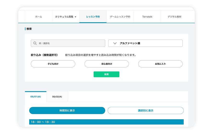 お気に入りの講師から探すもよし、初めての講師から選択してお気に入り講師を増やすもよし。
