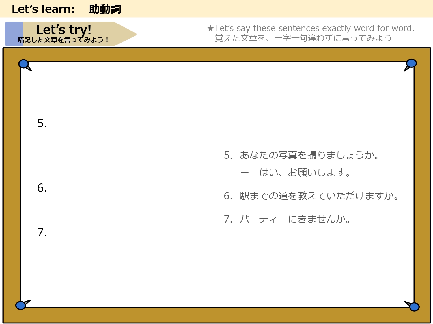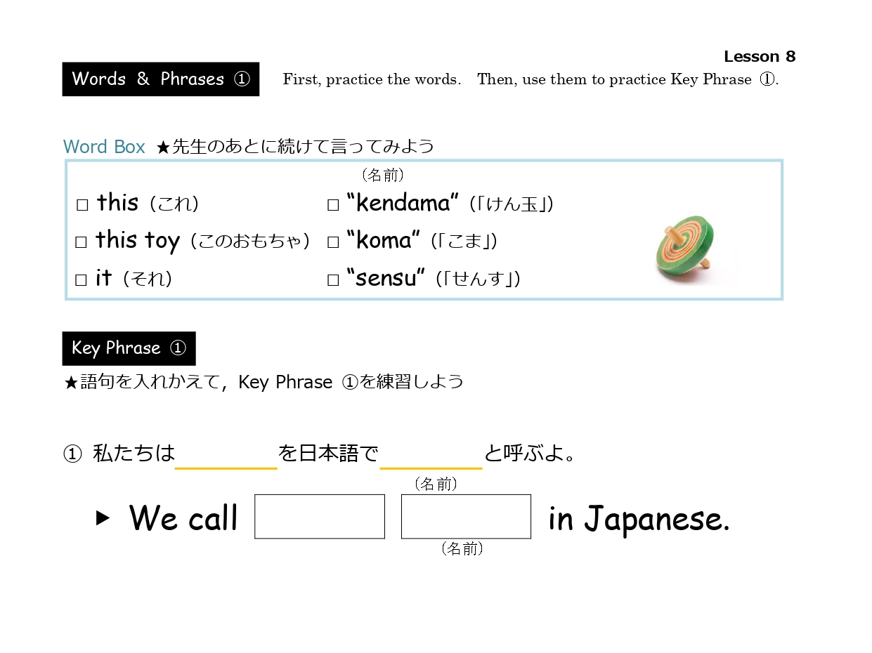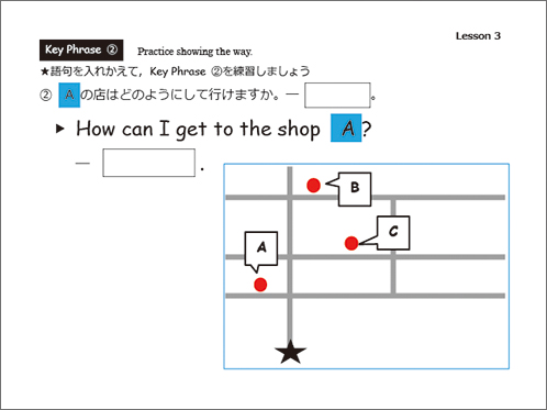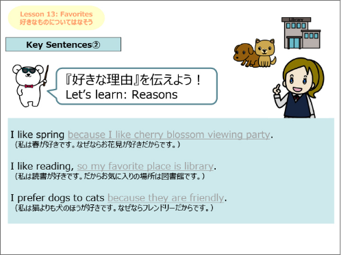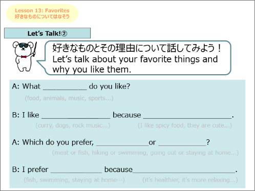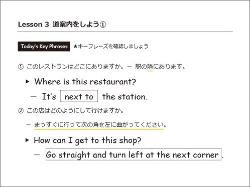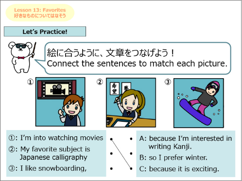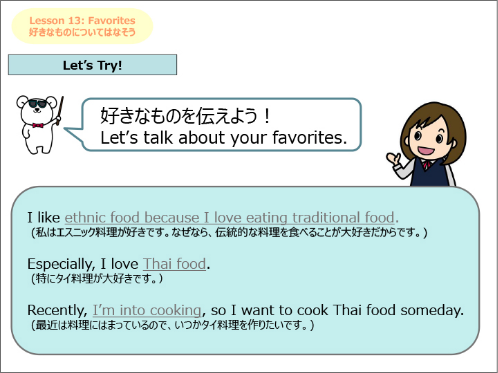 簡単な日本文化の説明や海外の方との会話でよく使うフレーズを、穴埋めやフレーズを入れ替えをしながらシチュエーション別に学習します。