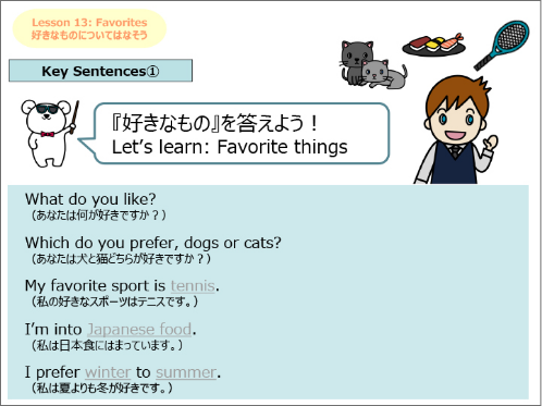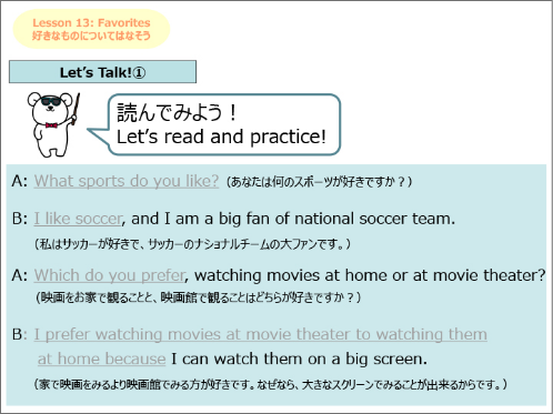 各シチュエーションに沿ったフレーズを学習するレッスンから、身近な話題や意見交換をテーマにしたレッスンまで幅広くカバーします。