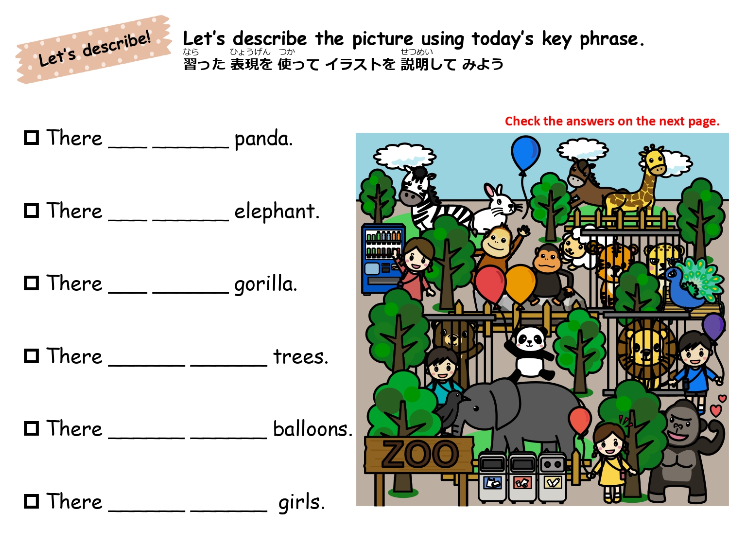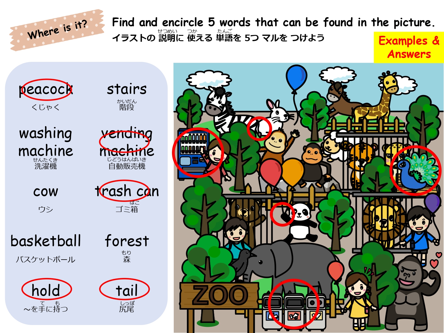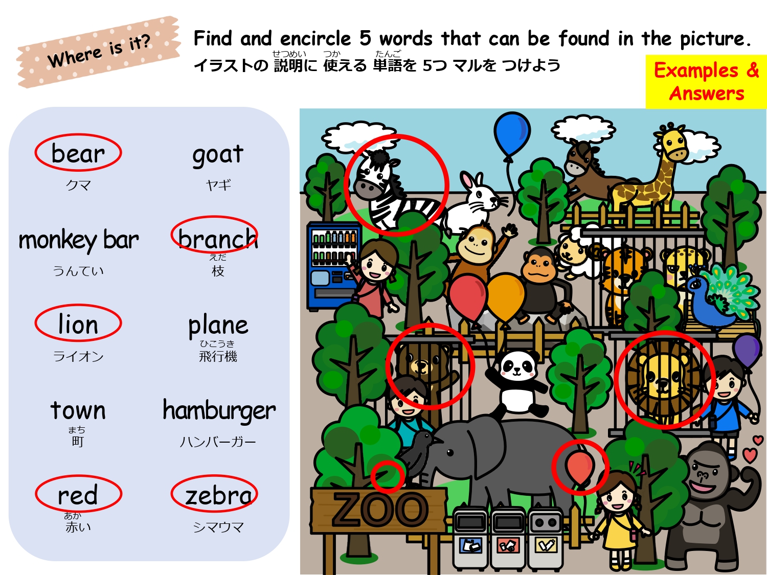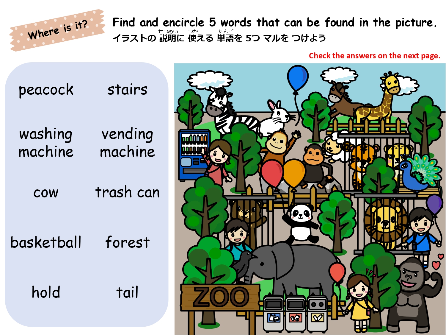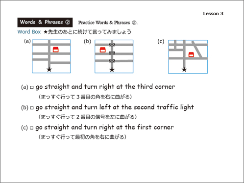まずは単語を学習した後、イラストのなかから単語の絵がどこにあるか探して遊ぶレッスンです。単語の音とイラストをマッチさせて覚えるほか、数を数えたりクイズに答えたりアクティビティをしながら楽しく単語を学びます。