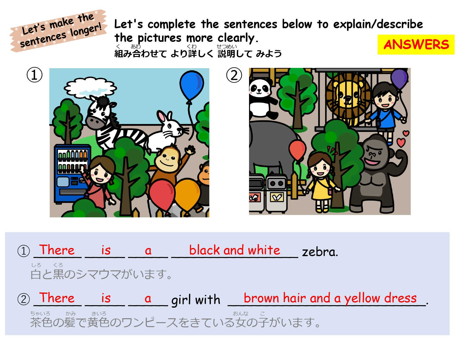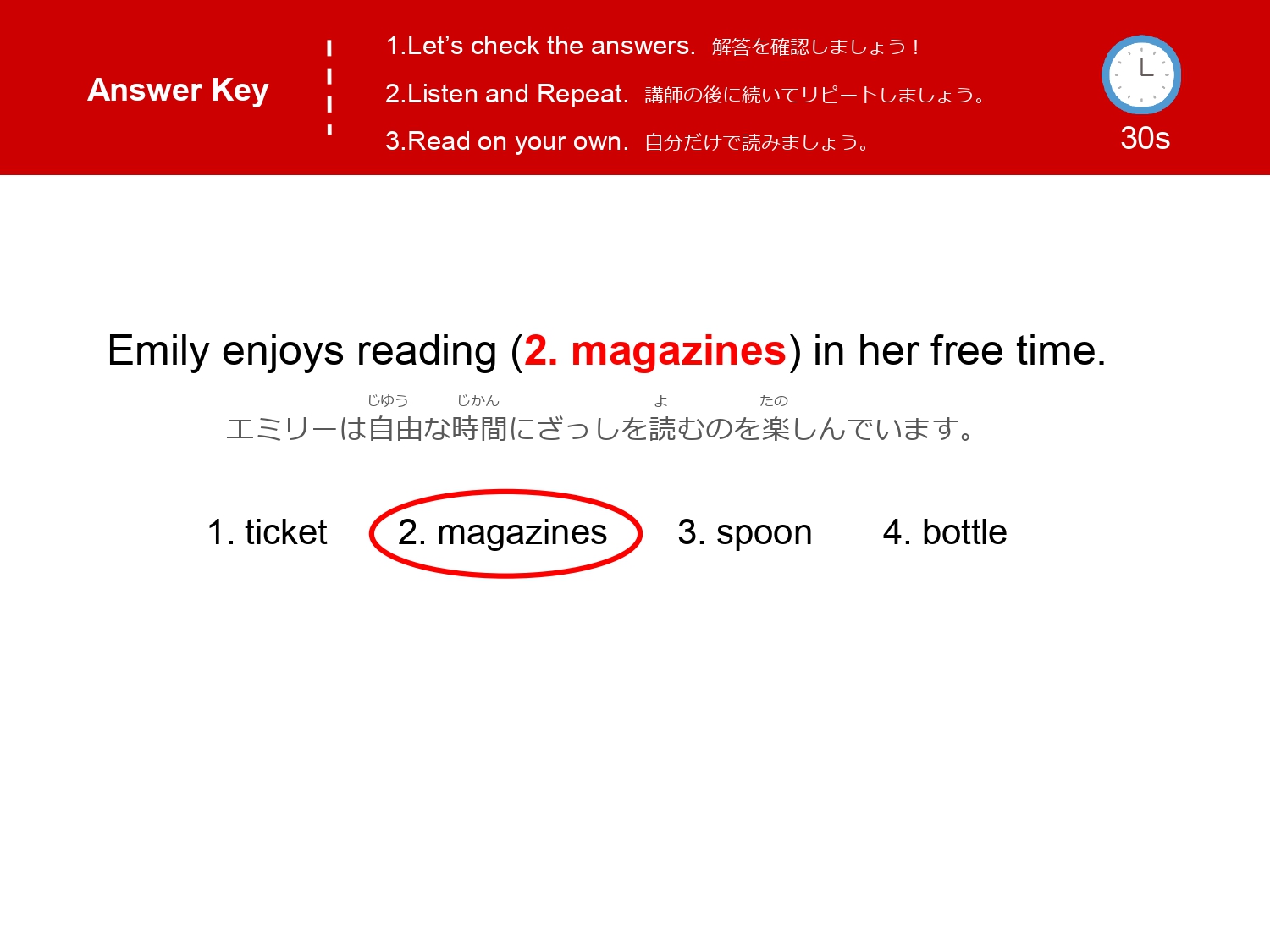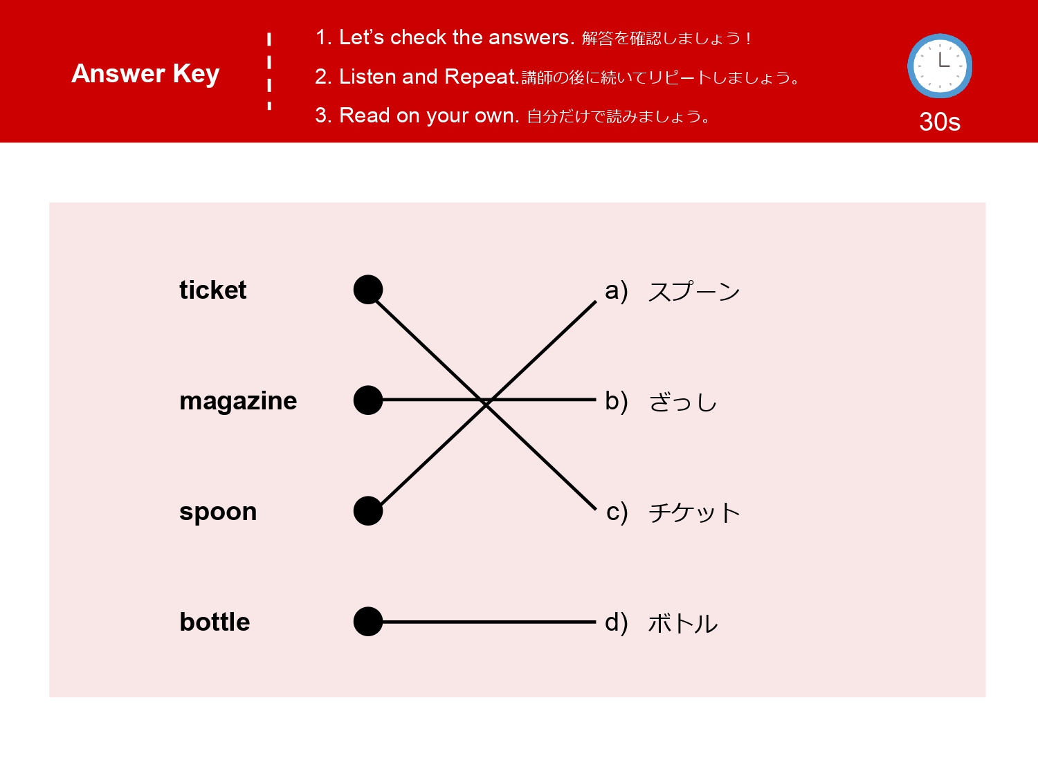まずは単語を学習した後、イラストのなかから単語の絵がどこにあるか探して遊ぶレッスンです。単語の音とイラストをマッチさせて覚えるほか、数を数えたりクイズに答えたりアクティビティをしながら楽しく単語を学びます。