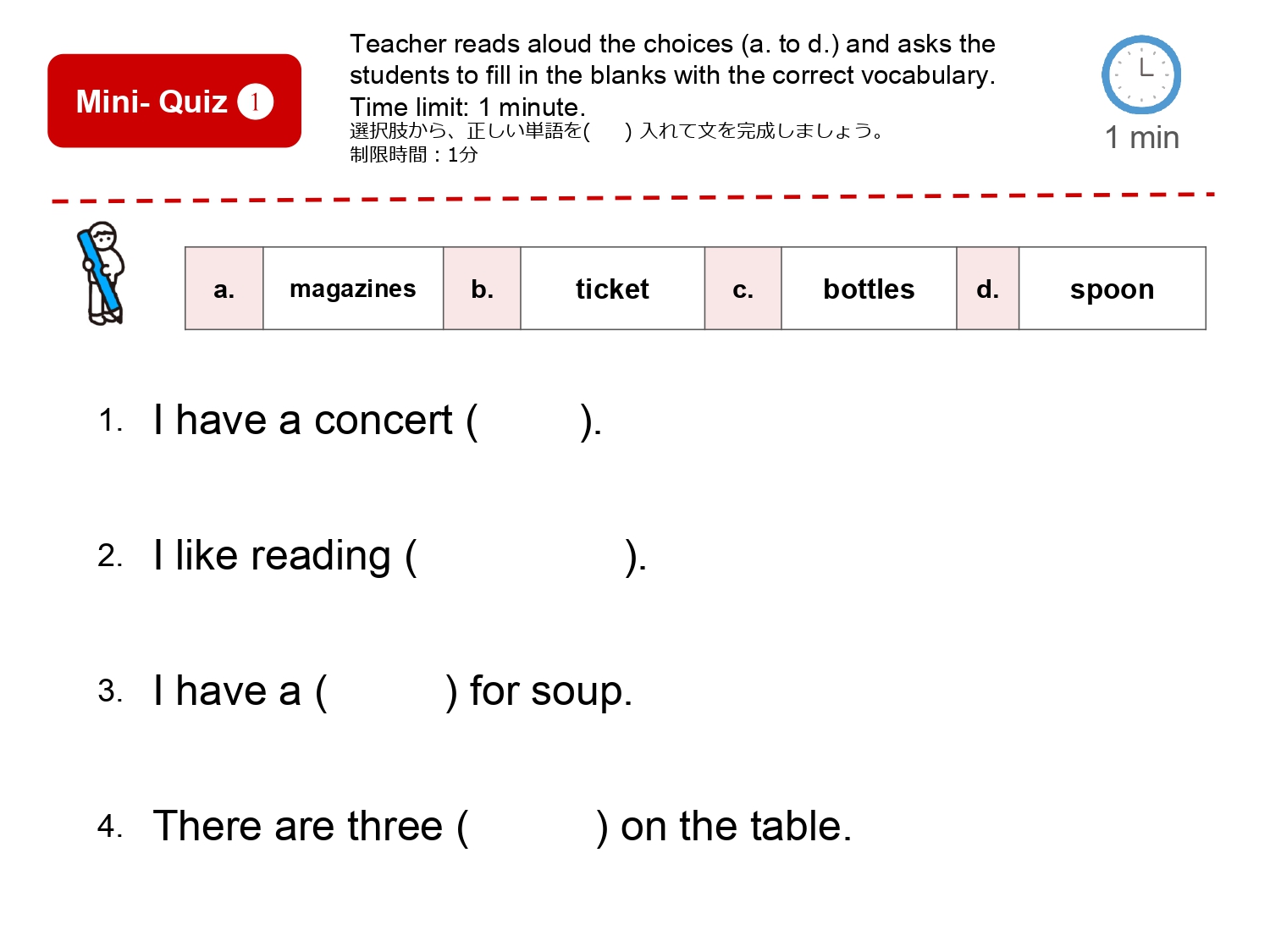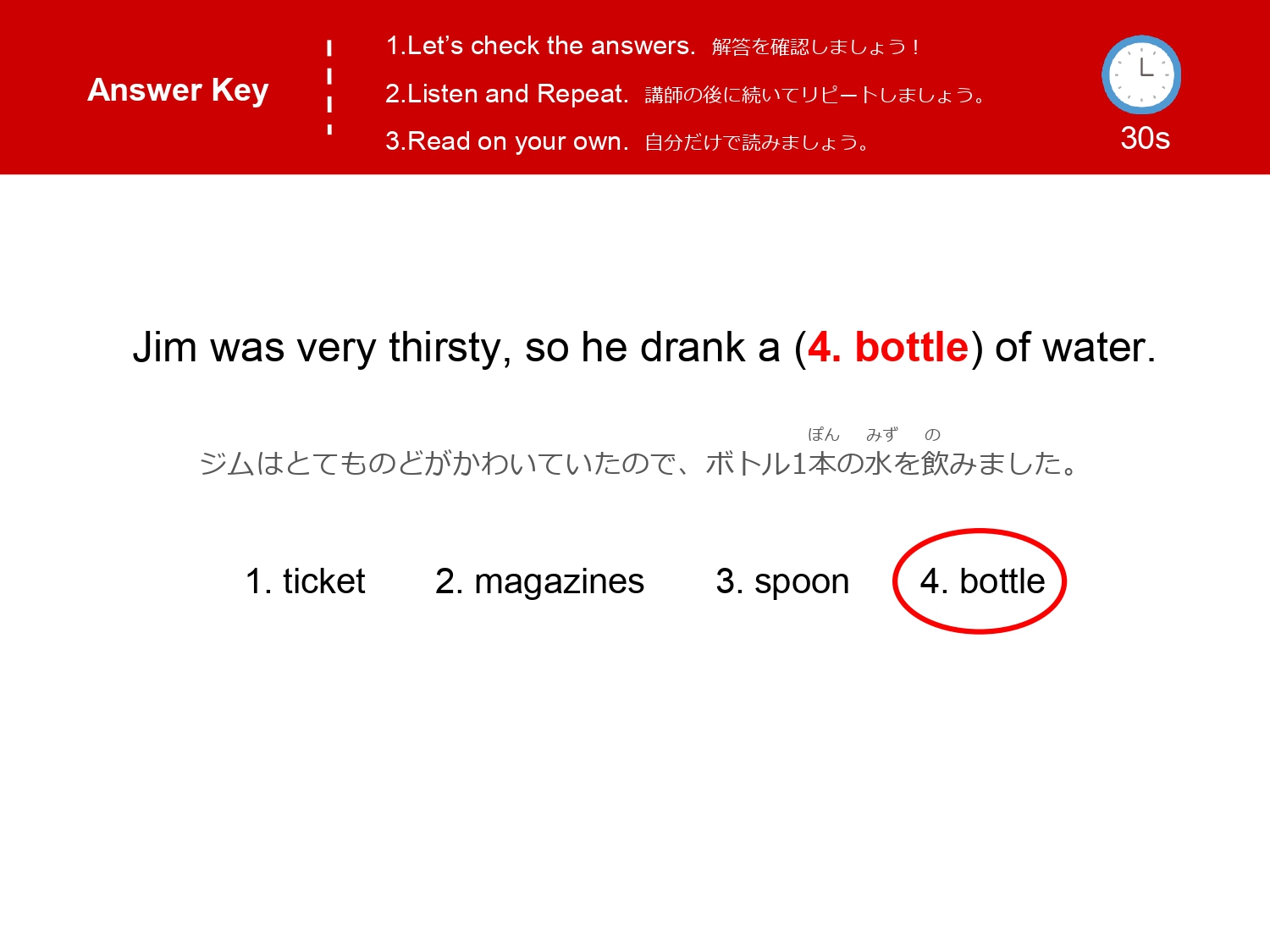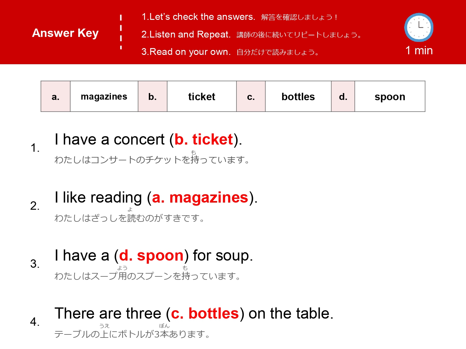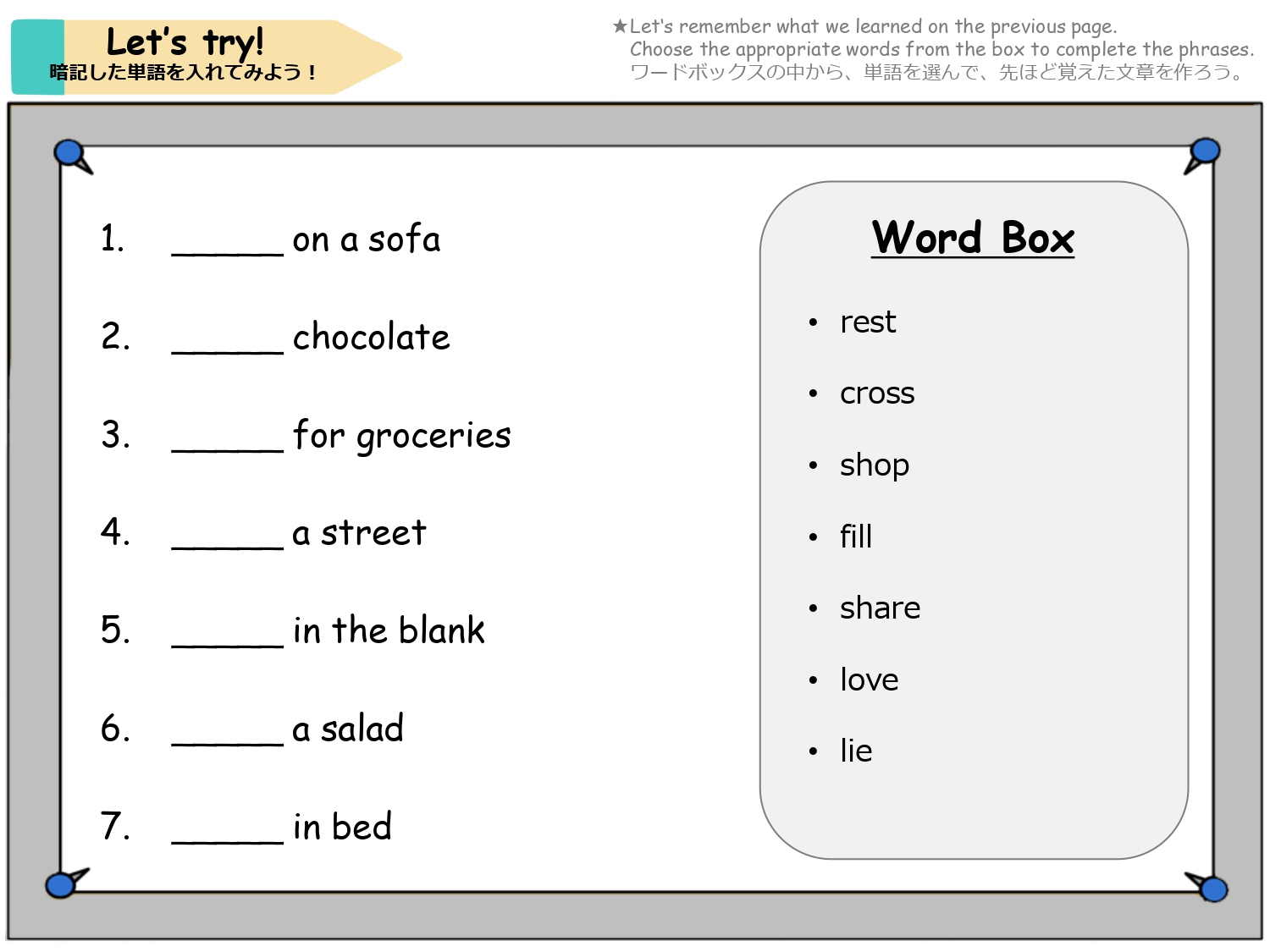 まずは単語を学習した後、イラストのなかから単語の絵がどこにあるか探して遊ぶレッスンです。単語の音とイラストをマッチさせて覚えるほか、数を数えたりクイズに答えたりアクティビティをしながら楽しく単語を学びます。