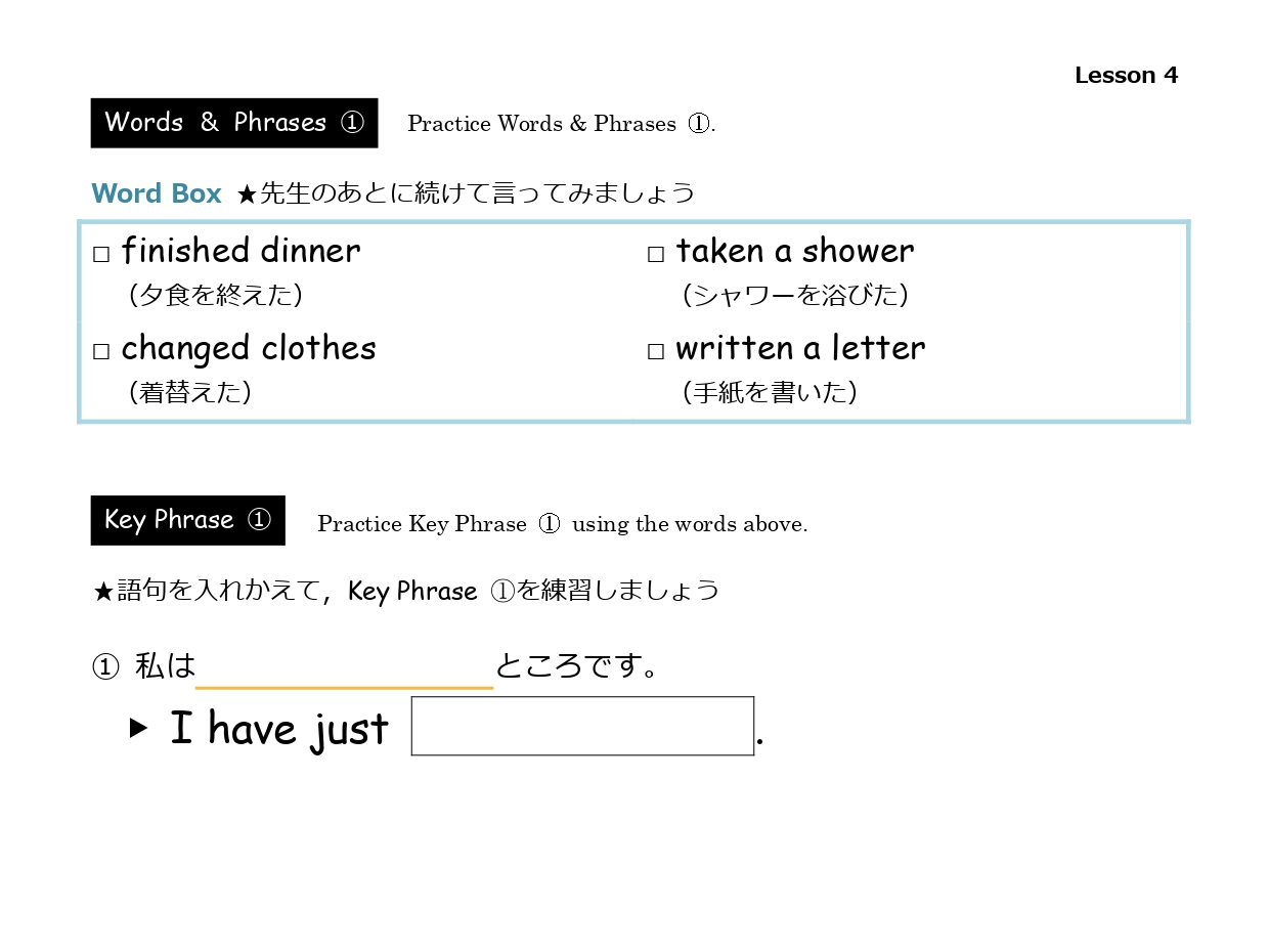 日本語を見て瞬発的に英文に変えられるように、反復練習をするレッスンです。中学生レベルの文法順に構成されていますが、あくまで1フレーズをまるっと形で覚えることに集中した学習スタイルです。
