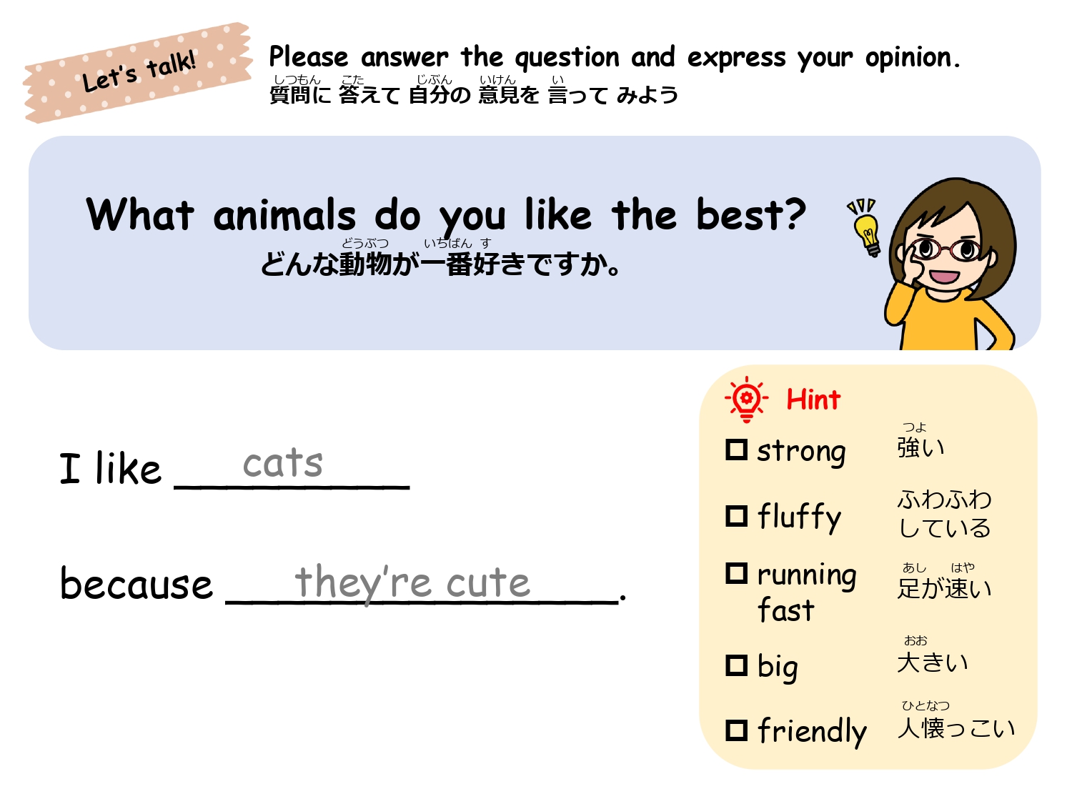 キーフレーズや穴埋め練習で慣れたら、レッスンの最後は学んだ文法を活かして、スモールトークに挑戦してみましょう。現役中学生の方、文法に自信がない大人の方にもお勧めのコースです。