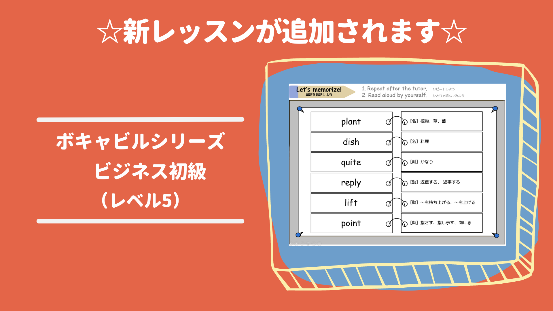 人気の英語試験に必須の英単語を中心に学べるボキャビルシリーズに、新レッスンが追加されます。